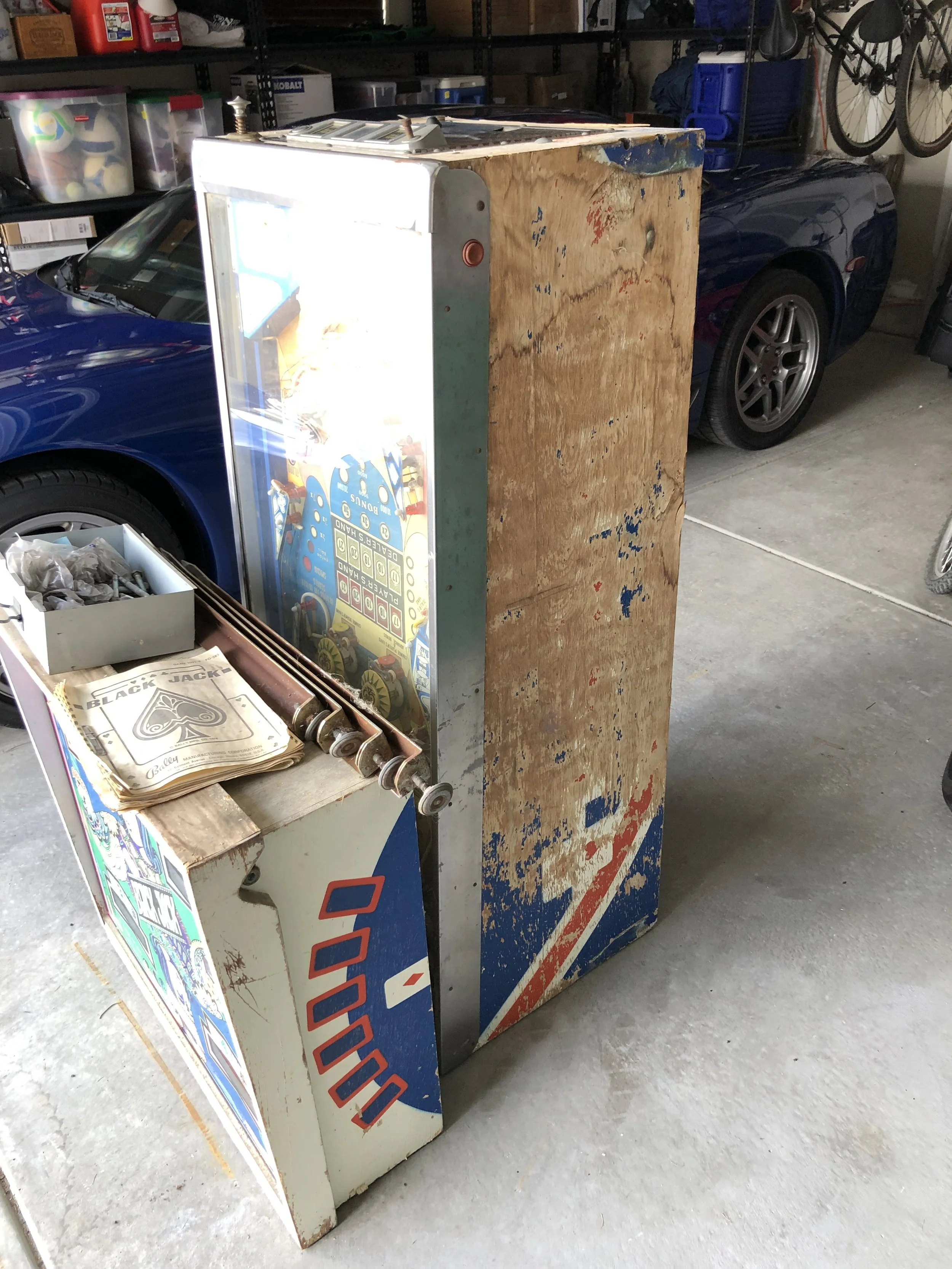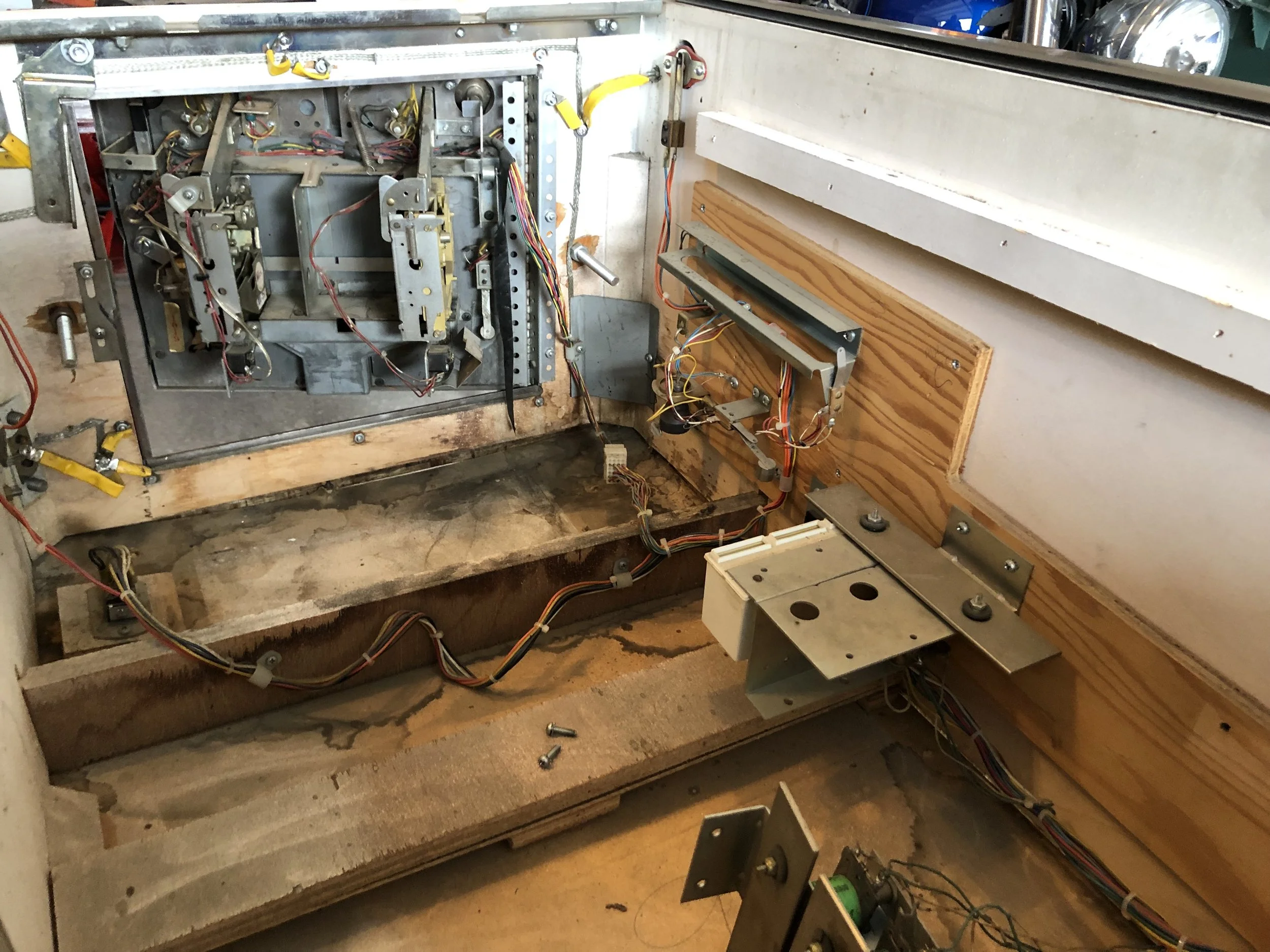 I found this in a consignment shop. The owner wanted $300 and stated “it turns on but doesn’t start a game”. The reality was that yes, the GI lamps light when power is applied but the MPU doesn’t boot so nothing happens (dark score displays). There were no keys, either. They wouldn’t let me drill open the locks to look inside and at least confirm it had a complete board set unless I paid for the machine. The floor was falling out and it’s obvious by the severe planking damage that it had been exposed to the elements for while. So I rolled the dice…we settled on $100 and I drilled out the locks.