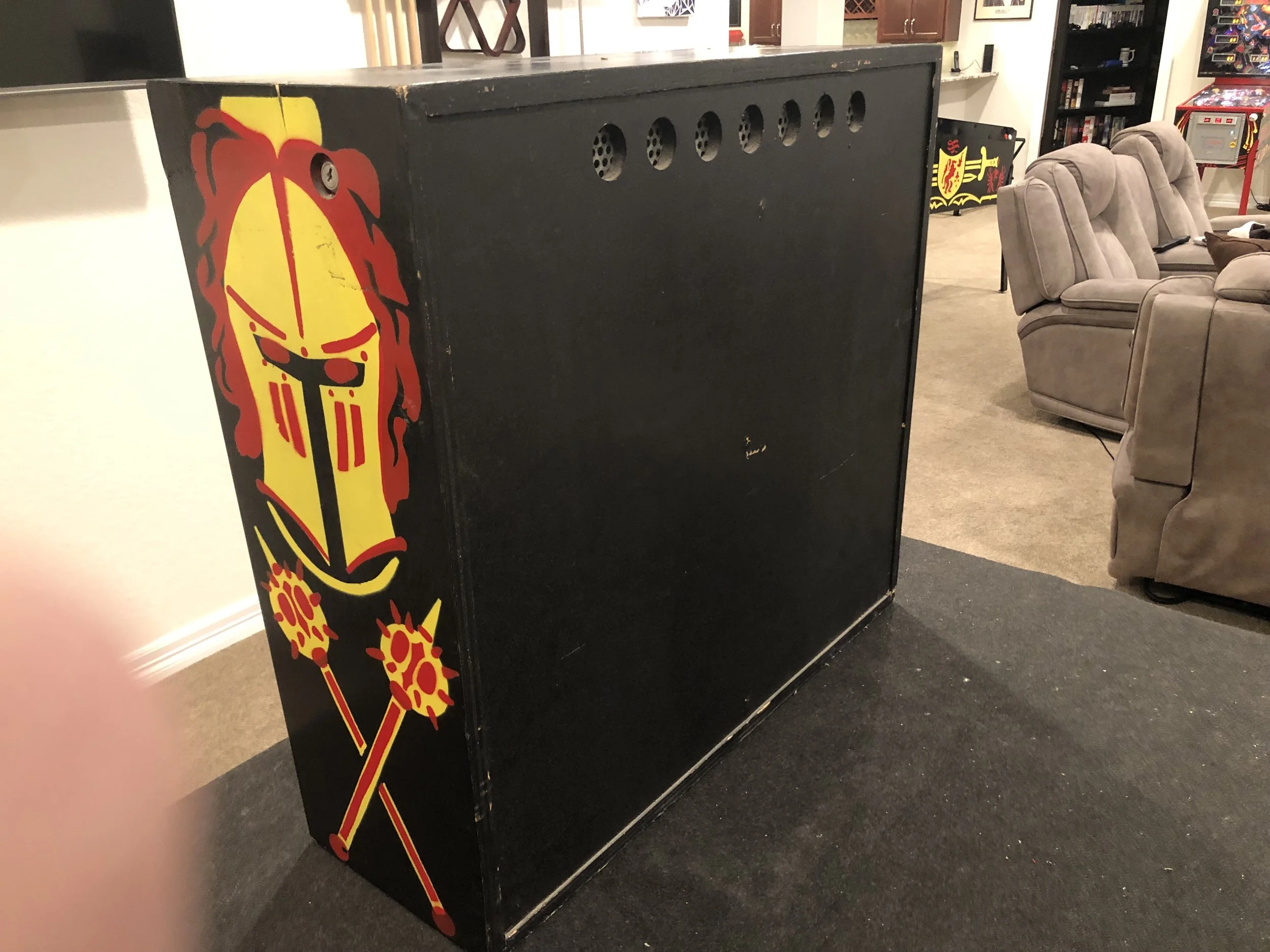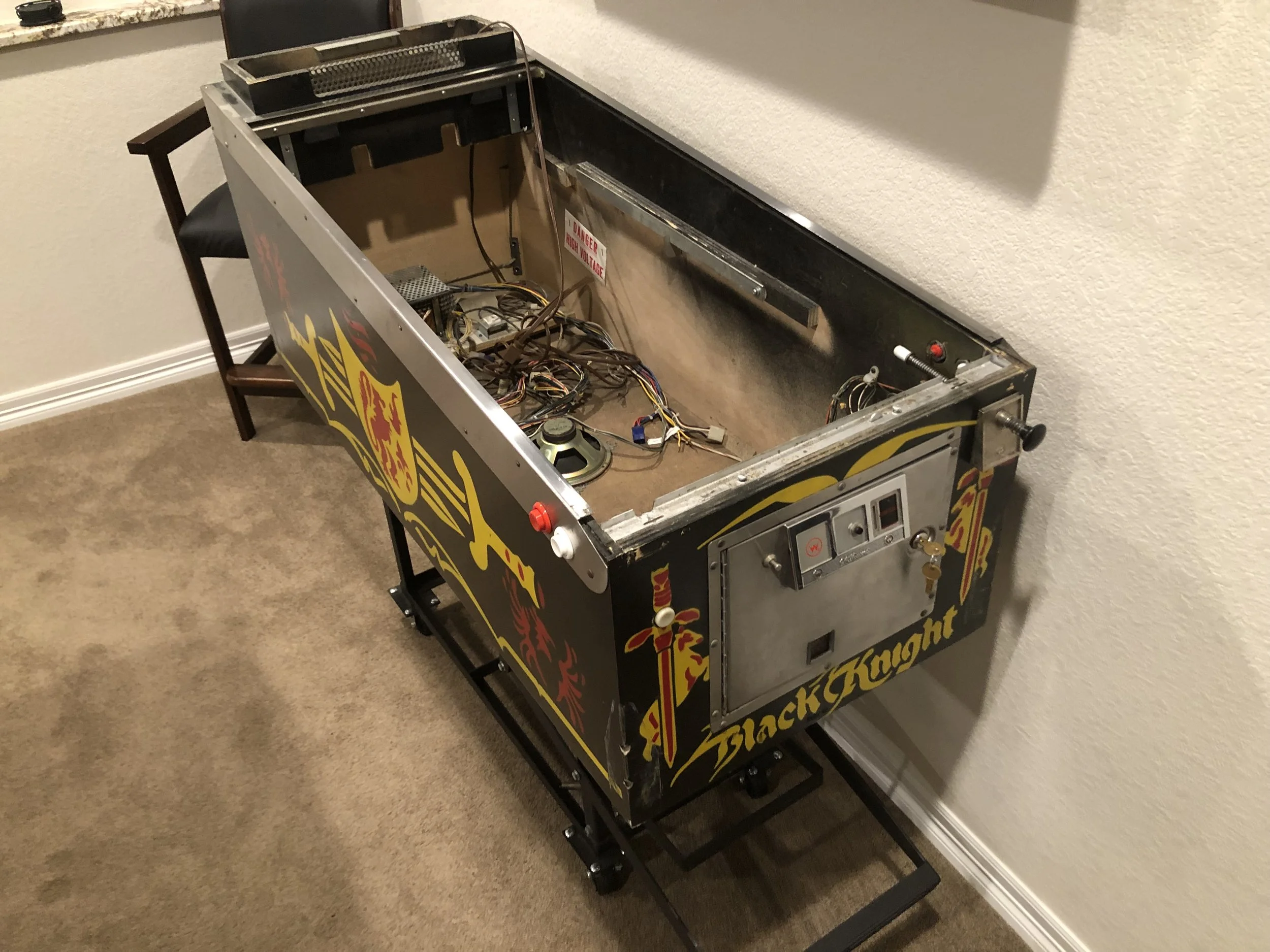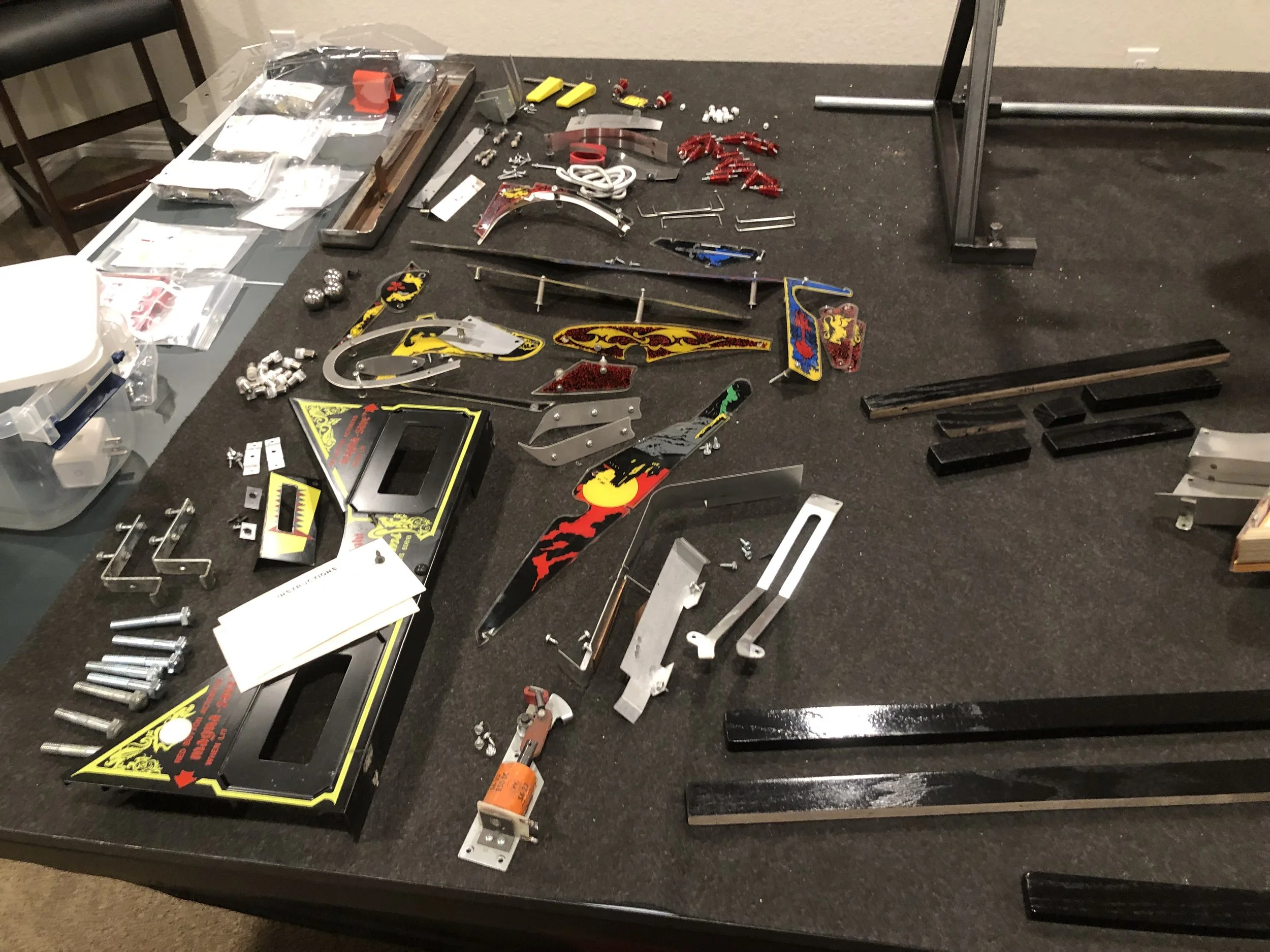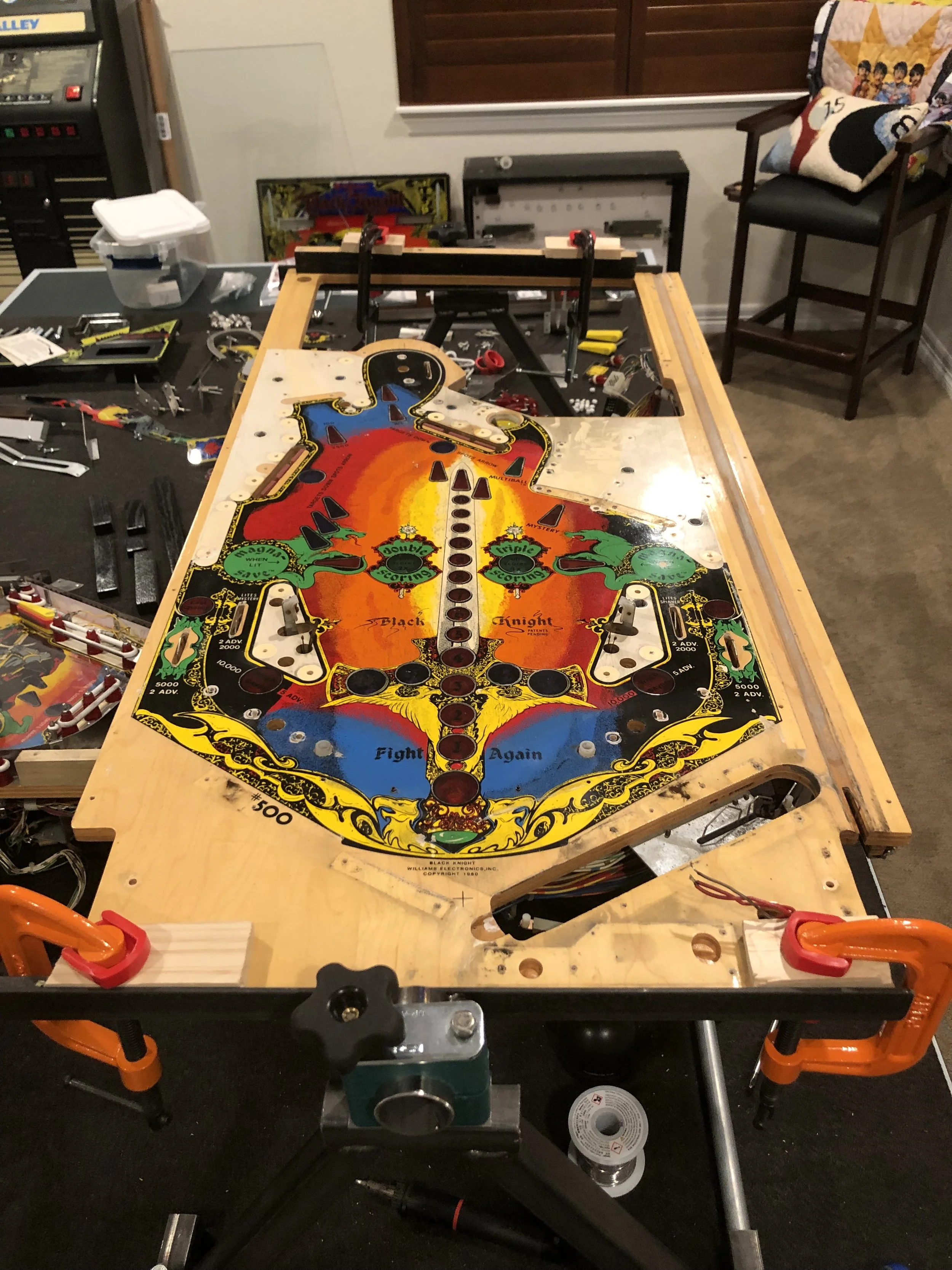 Started to get some new customization ideas during tear down and decided to go with a “blacked out Black Knight” theme. This would include black playfield rails instead of natural wood, black flipper bats with red rubbers, and black posts instead of red. I also wanted to figure out some ways to light up the dark areas of the playfield (more on that later). I also decided to powder coat the armor in black….side rails, legs, lock down bar, and even the coin door.