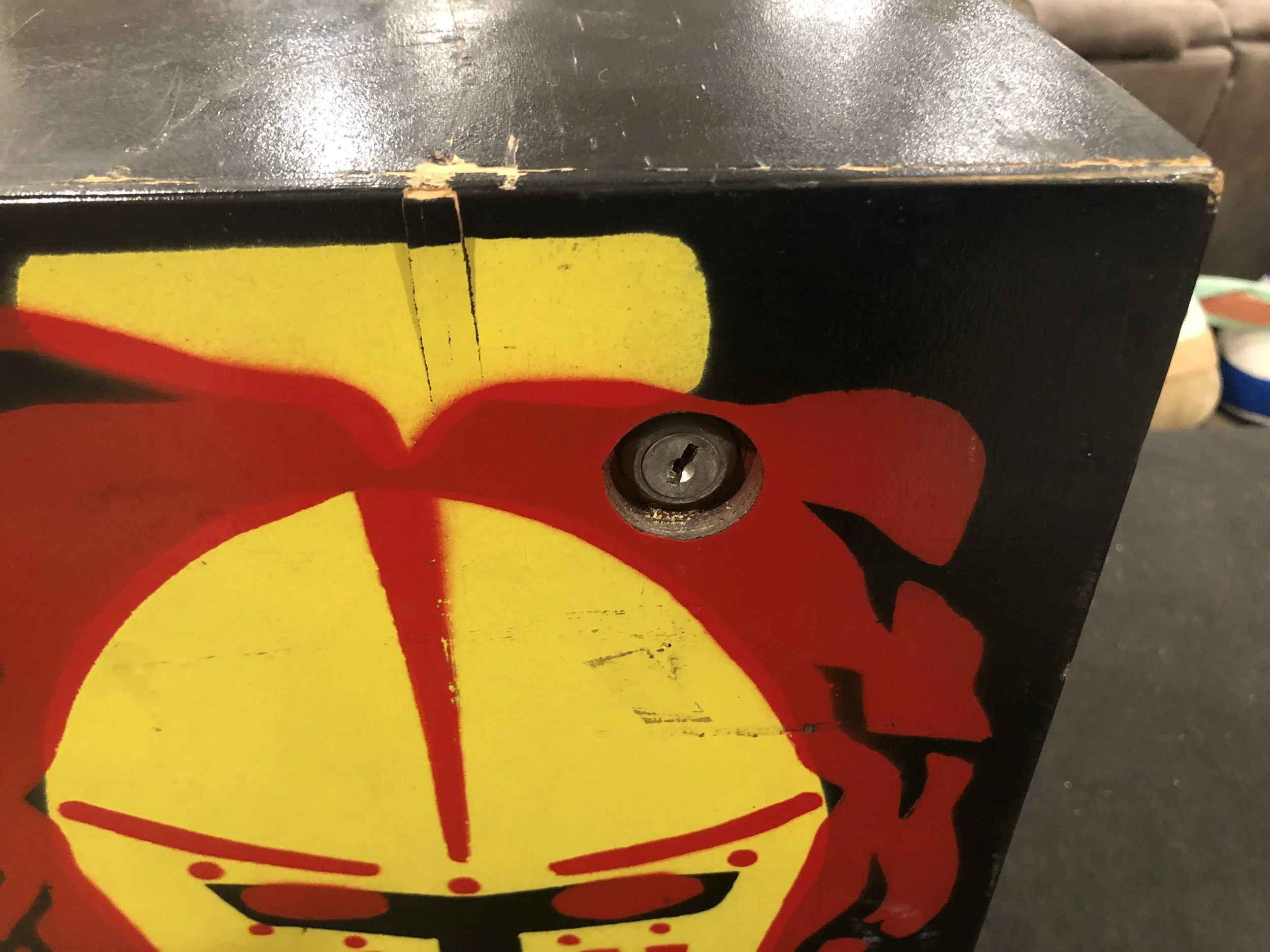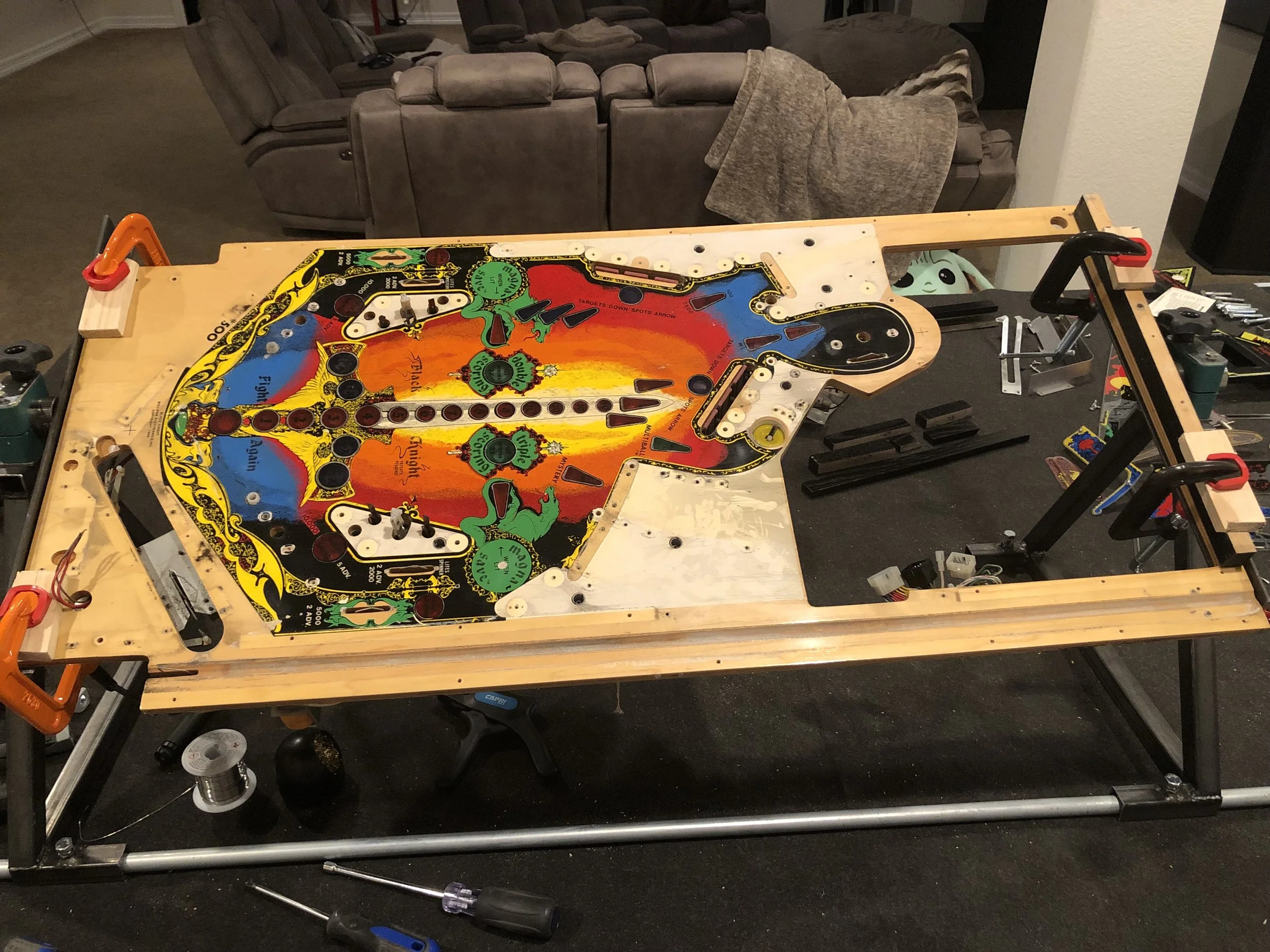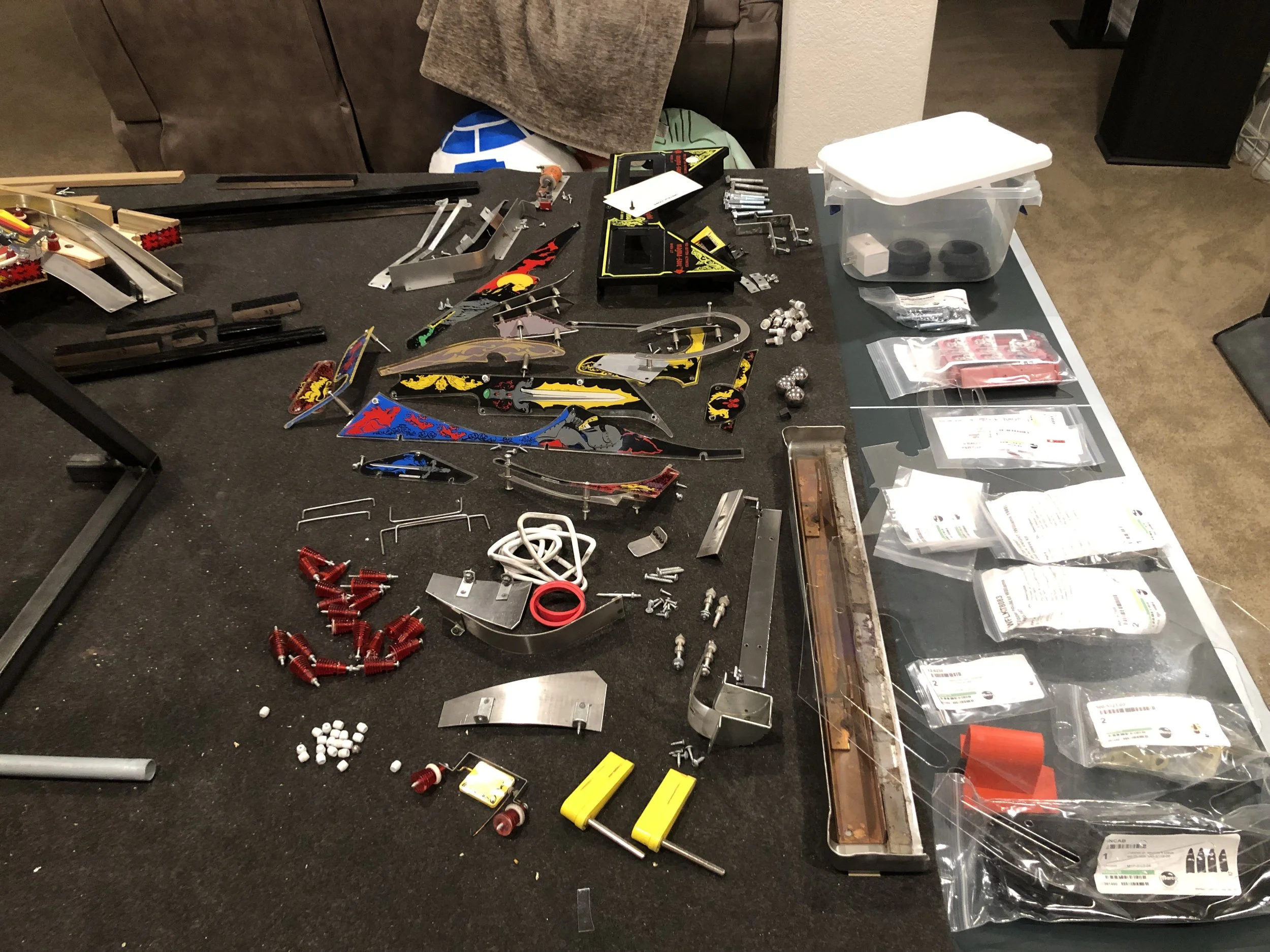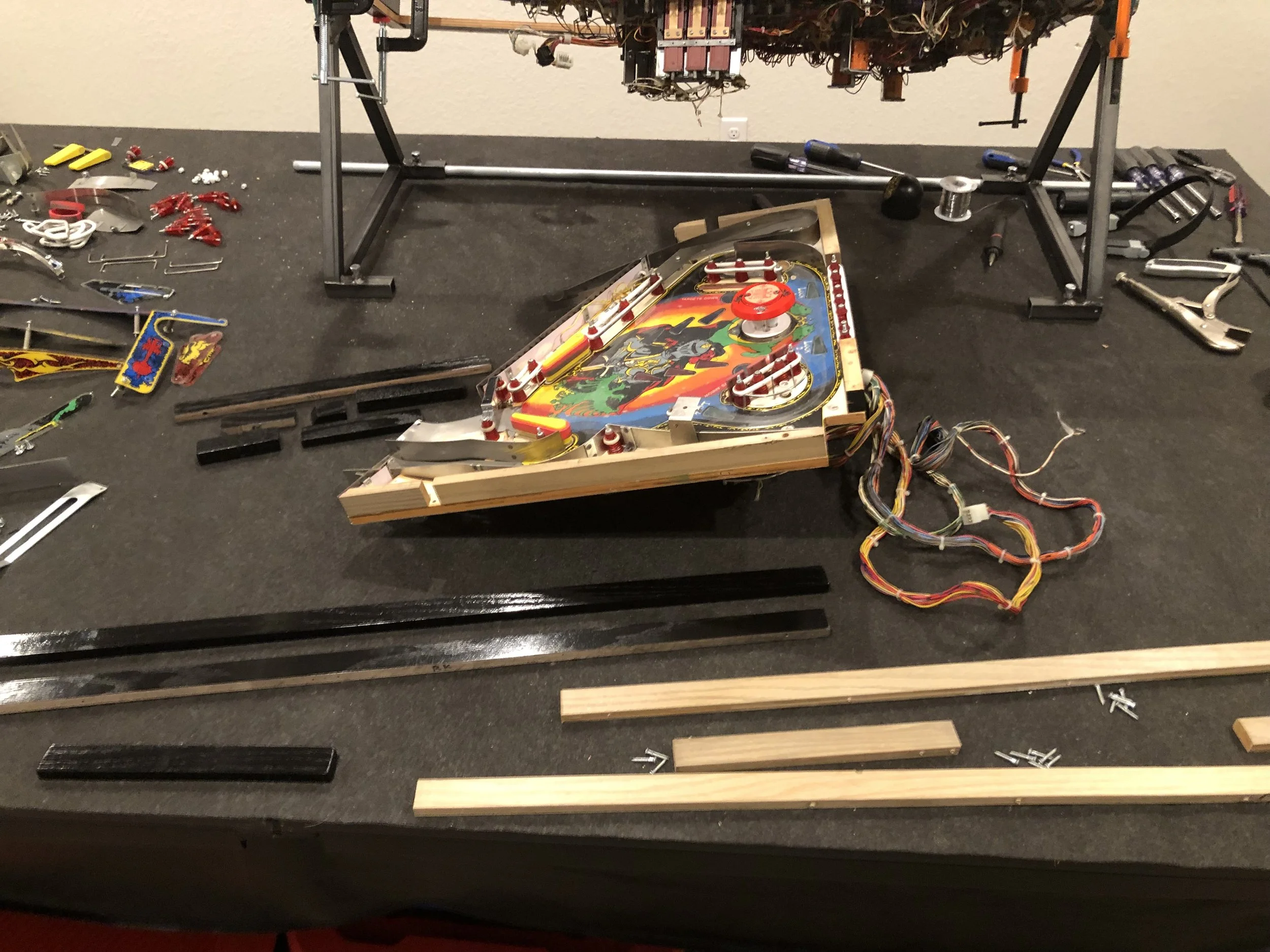 Started to get some new customization ideas during tear down and decided to go with a “blacked out Black Knight” theme. This would include black playfield rails instead of natural wood, black flipper bats with red rubbers, and black posts instead of red. I also wanted to figure out some ways to light up the dark areas of the playfield (more on that later). I also decided to powder coat the armor in black….side rails, legs, lock down bar, and even the coin door.