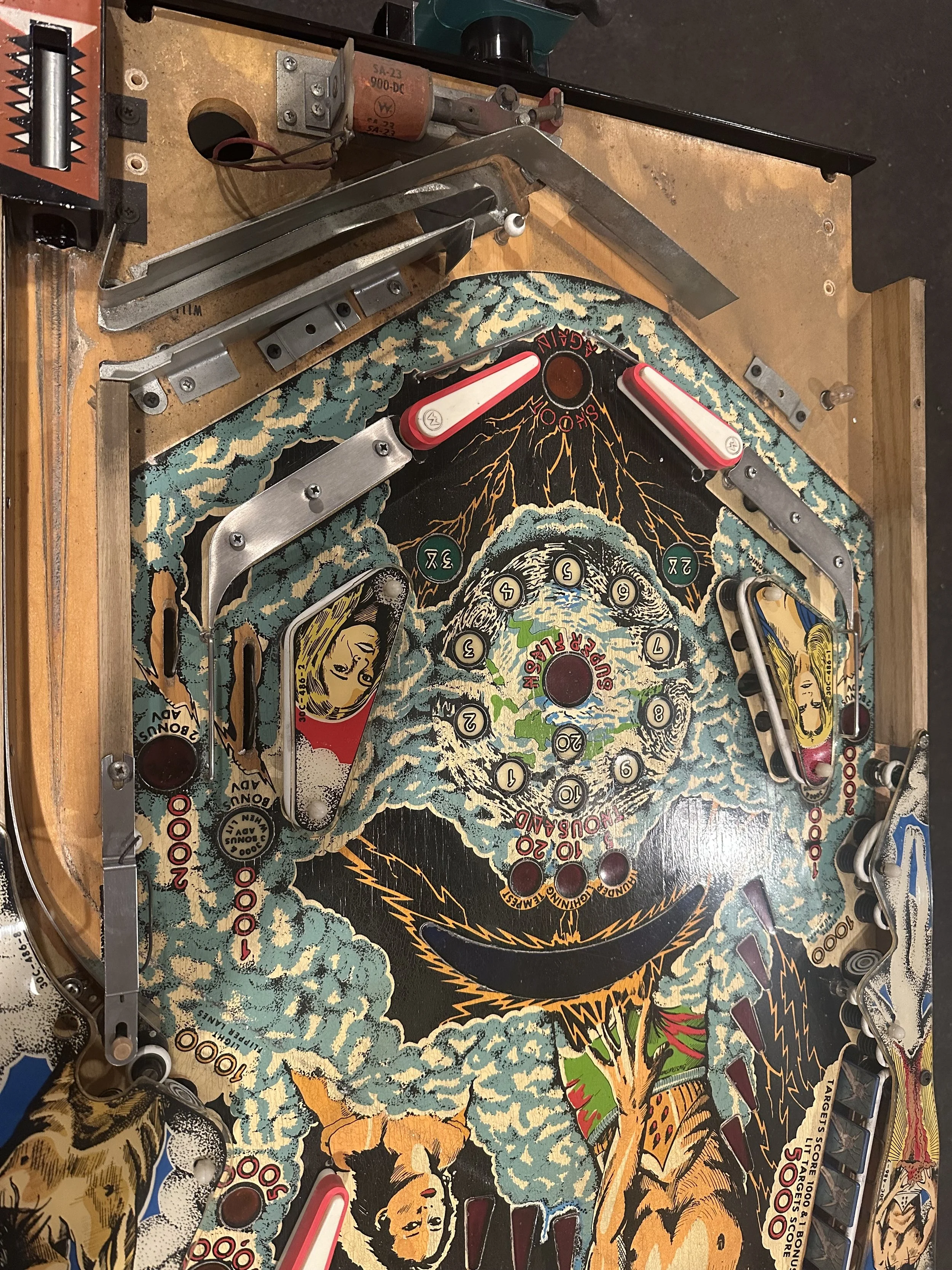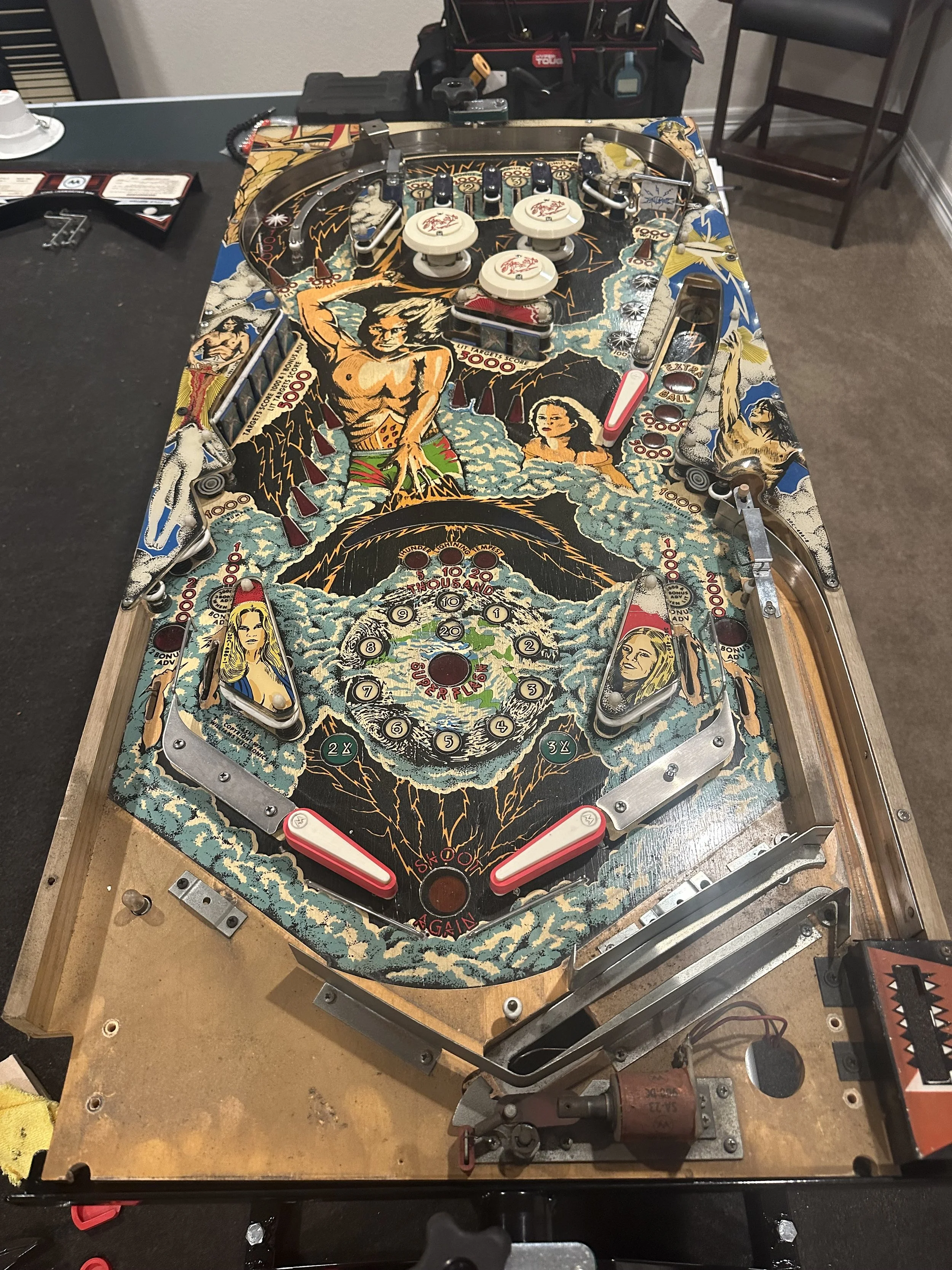 The backglass and playfield were ok - if I was going to shoot for a player’s condition pin, I’d do some touch up paint, rattle can clearcoat, and polish it up it bit. But my goal here was a “factory fresh” restoration so both will be replaced with reproductions, along with a new set of plastics.