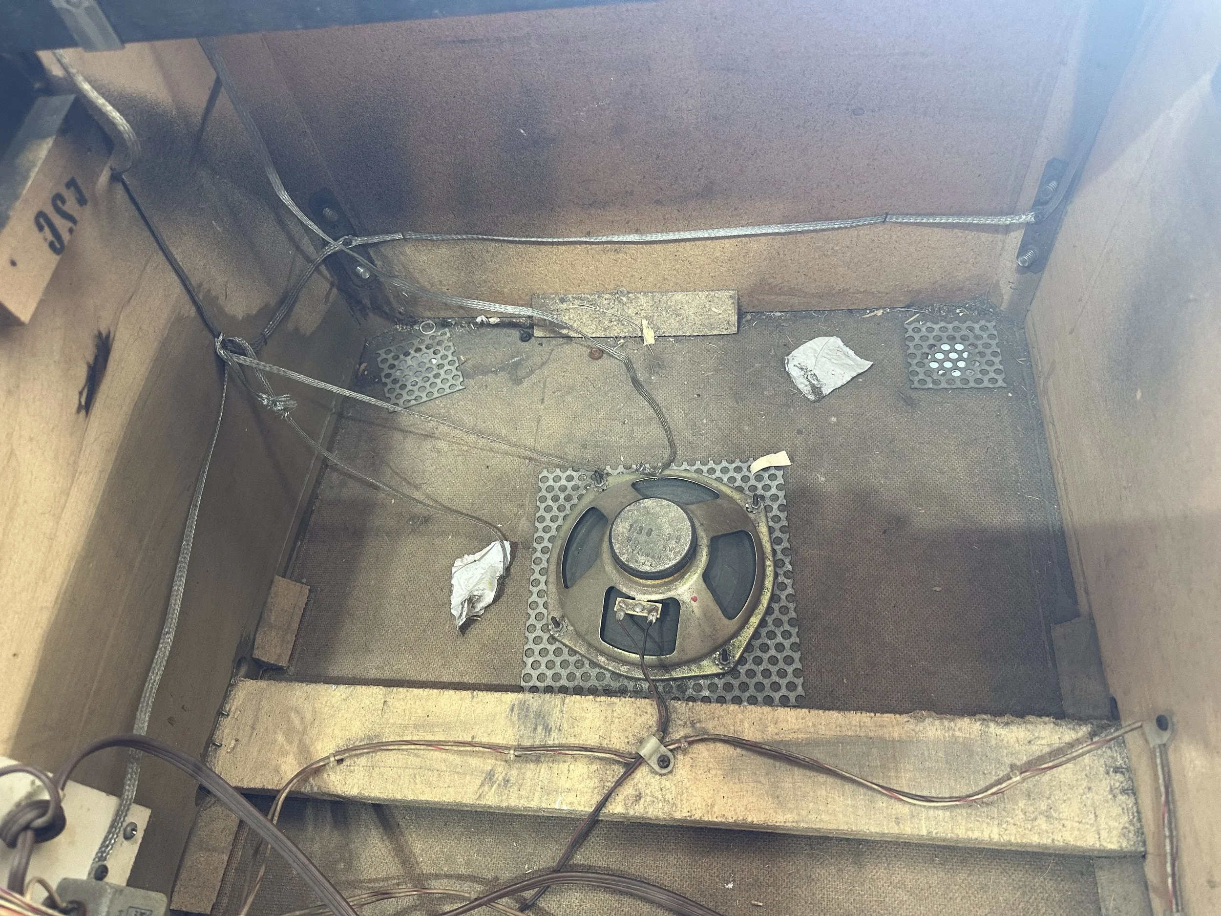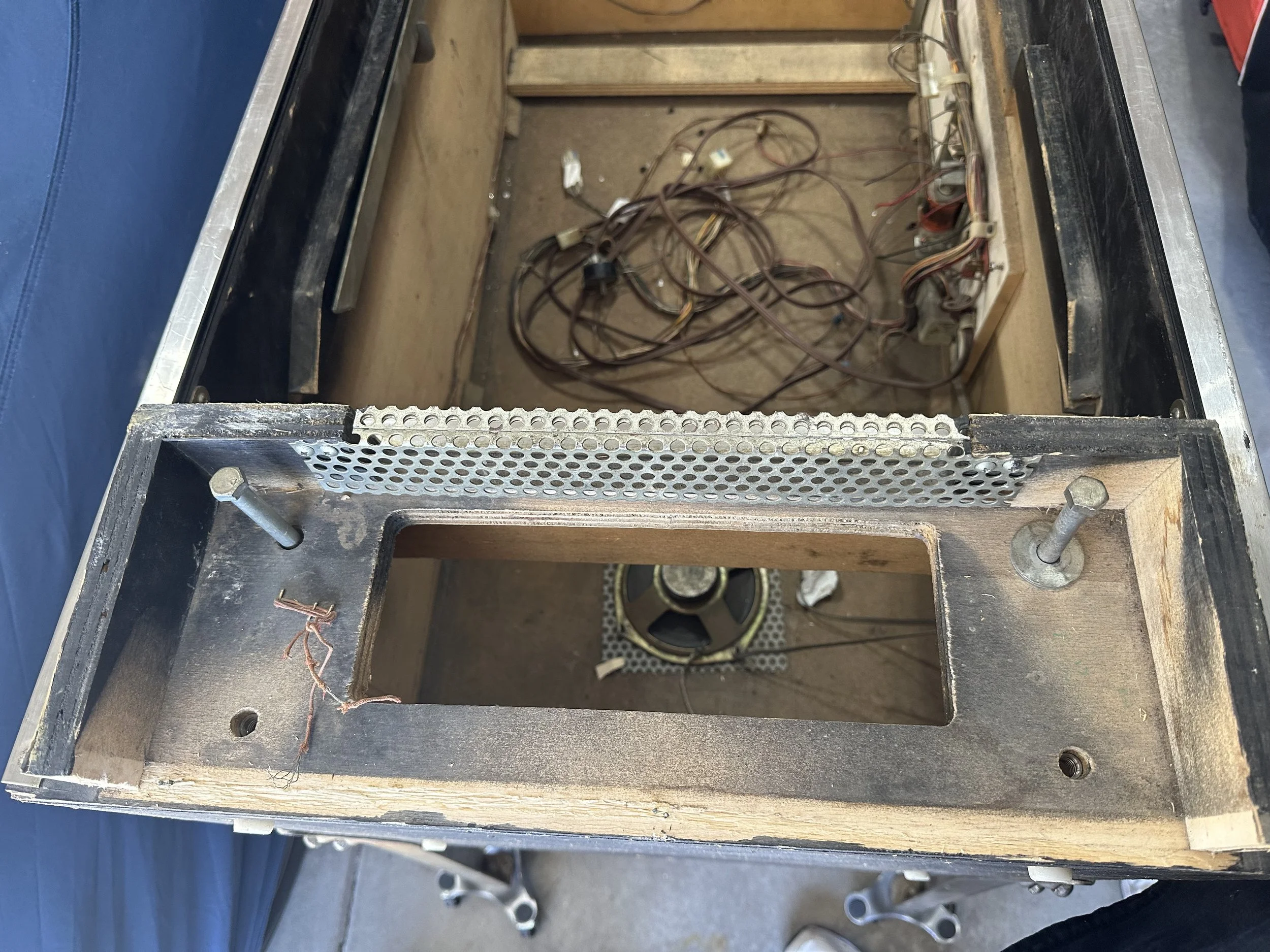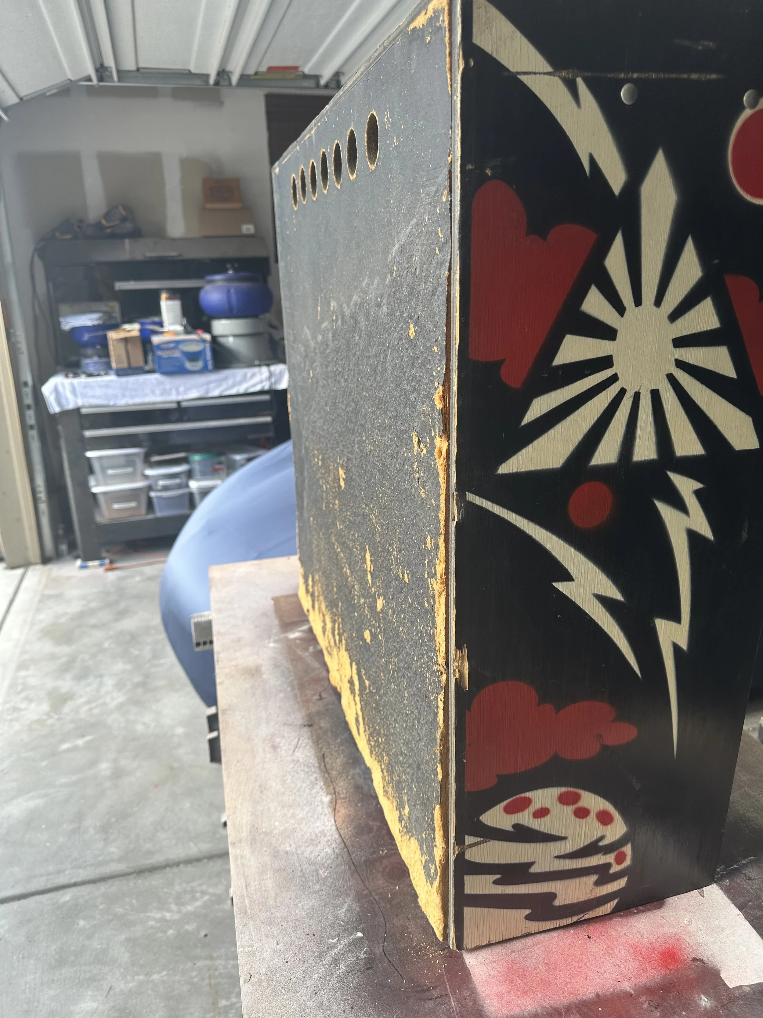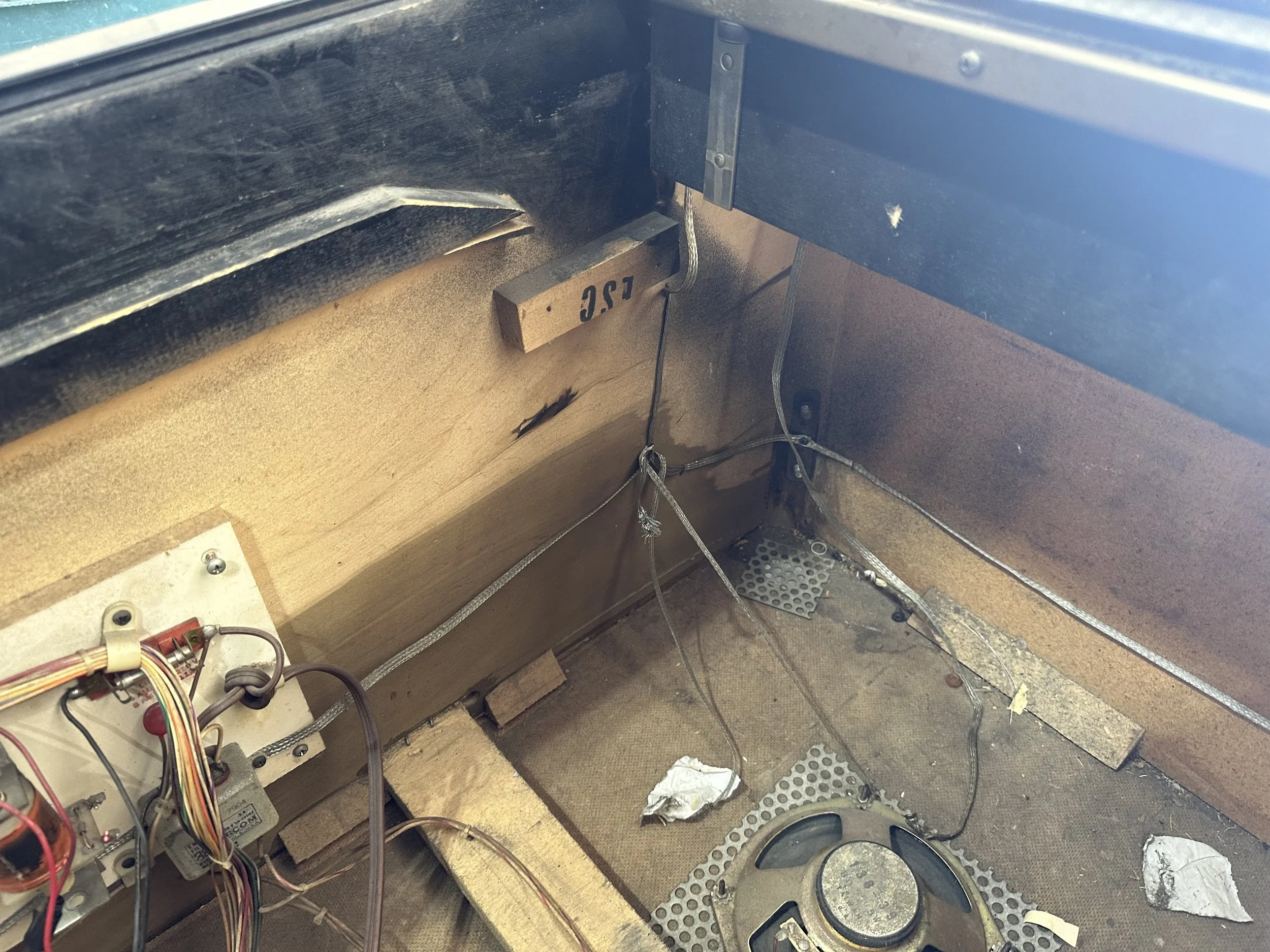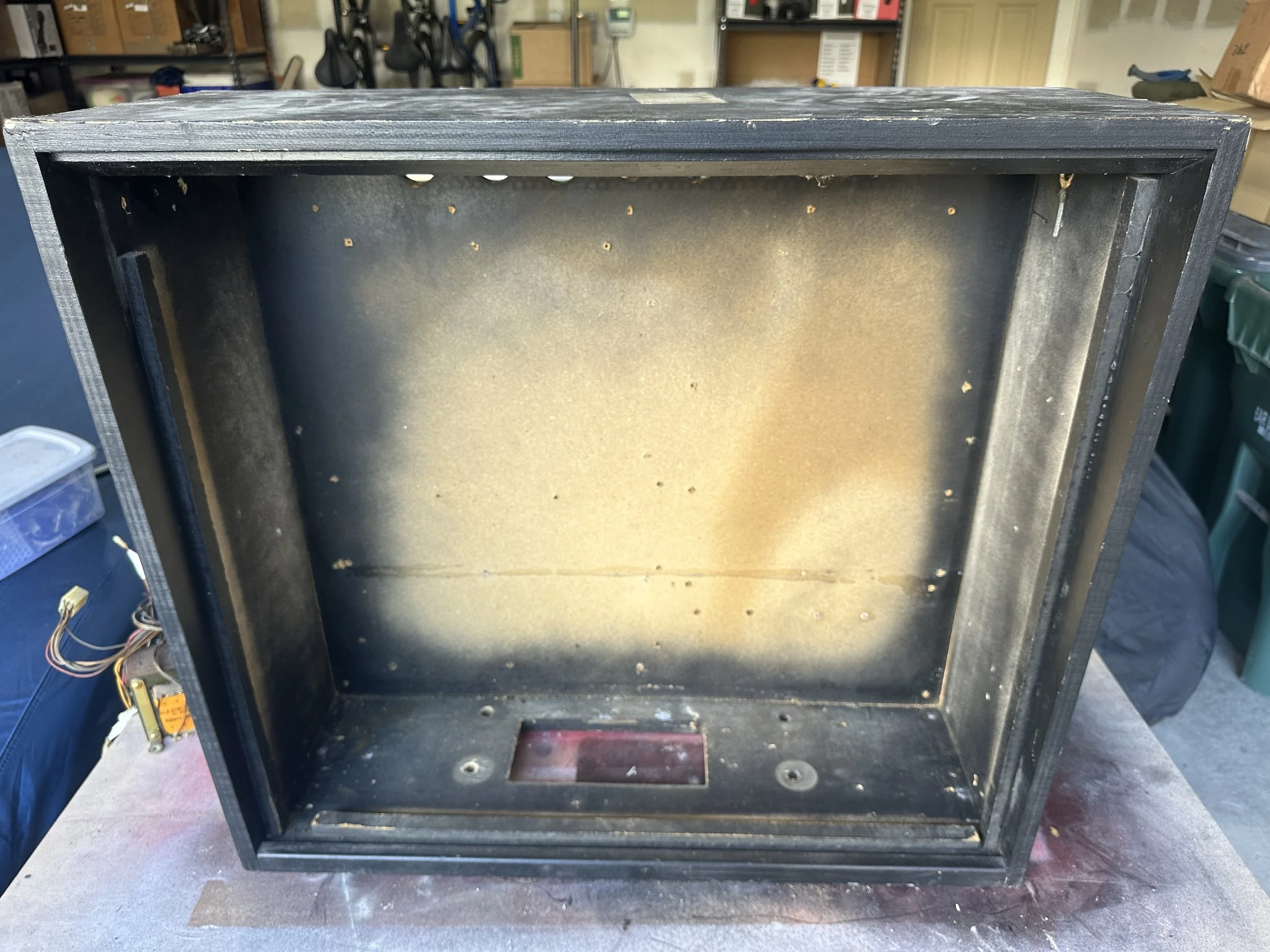 On the cabinet side - it had certainly seen better days. The neck on the bottom cab was broken off (but the pieces were included!). The bottom edge of the bottom cabinet was pretty much destroyed - I saw a lot of bondo or resin work in my future there. Plus all of the support edging that holds in the floor from the underside of the bottom cabinet was either suspect or missing, causing the floor to sag. The rear of the backbox was swollen from water damage with all sorts of MDF fibers busting out around the edges. This cab was going to need a lot of work.