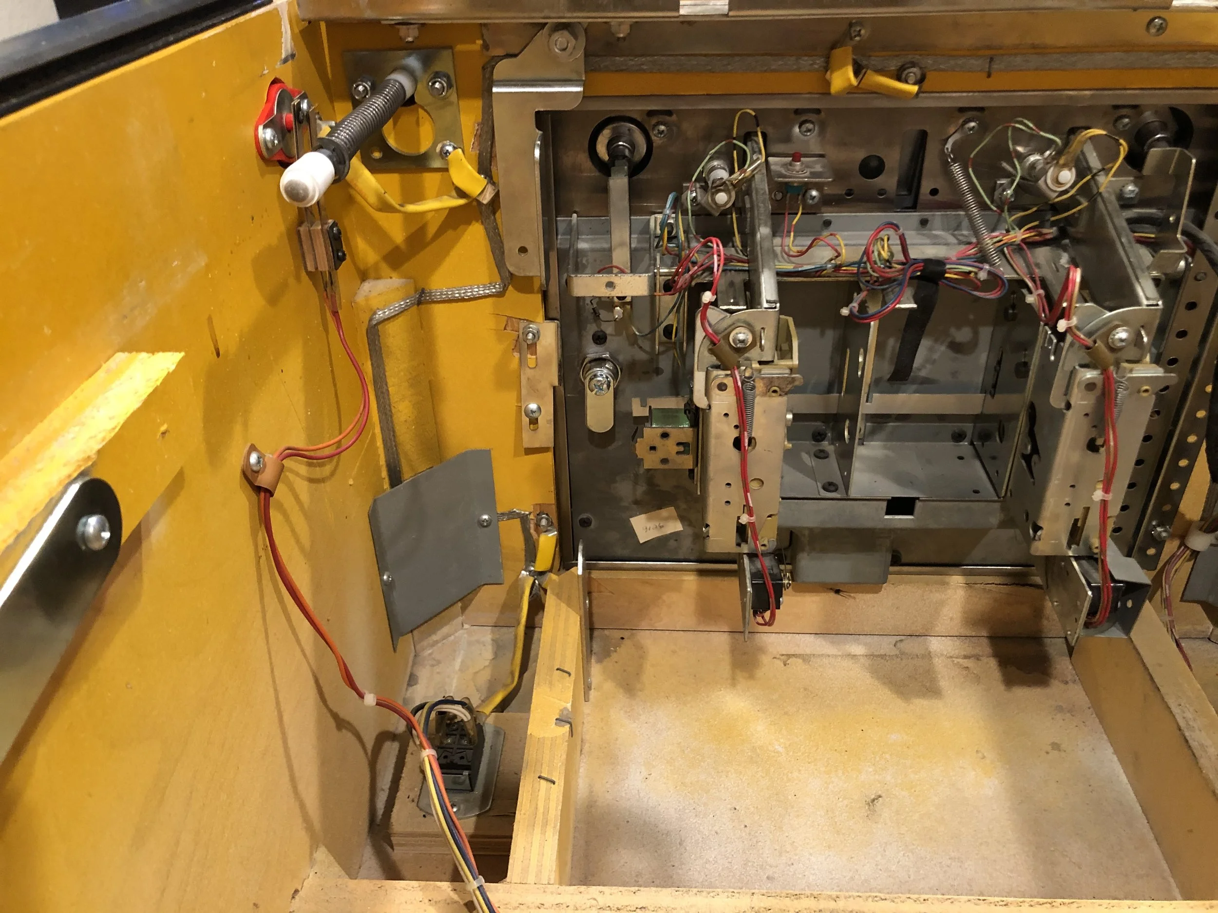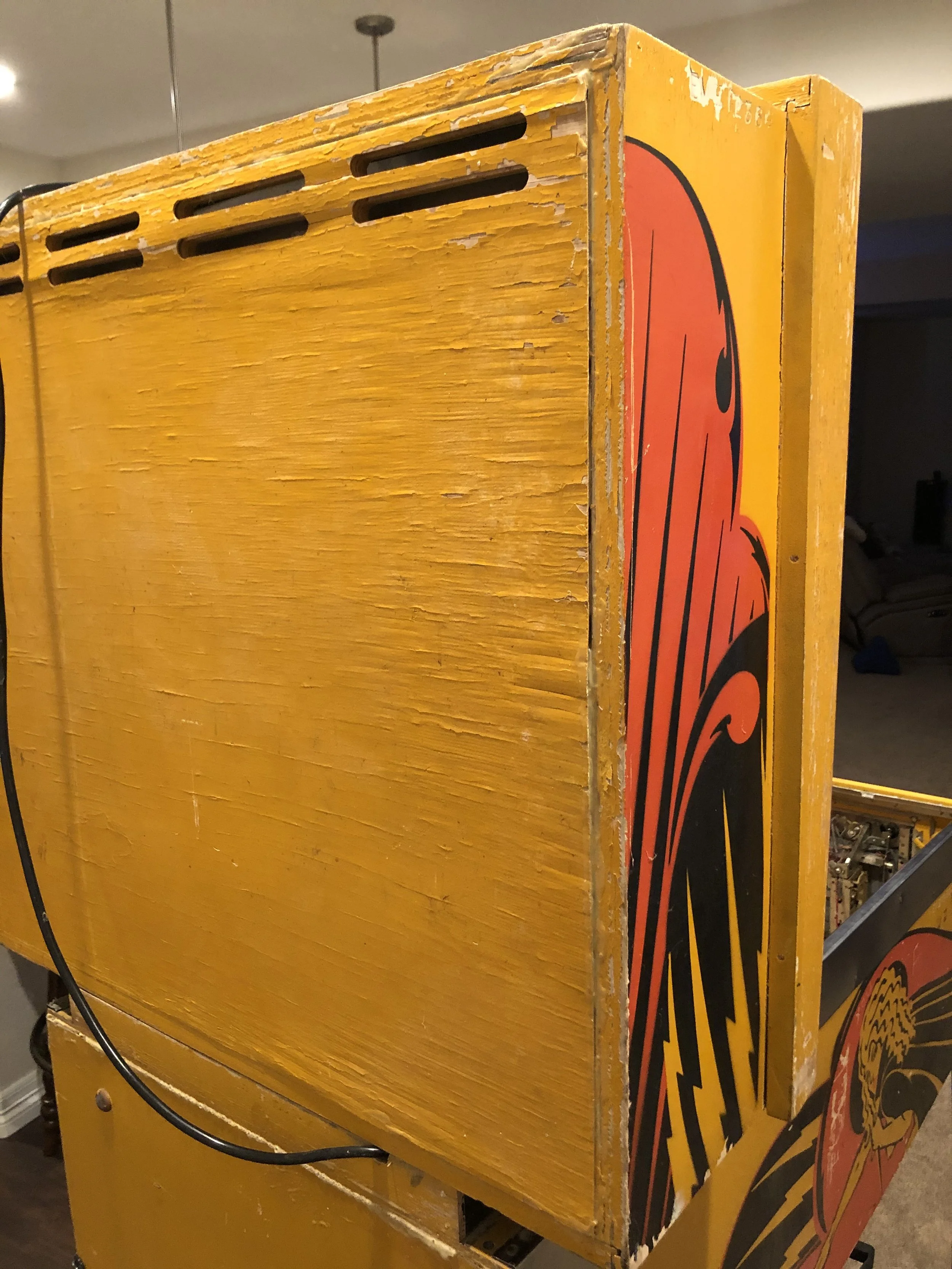In addition to the normal wear and tear and damage you’d expect for a pin that probably spent the majority of its 40+ year life in bars and/or an arcade, the rear of the backbox had some water damage and the lower cab had edge and corner damage. Other than that, the overall pin was in fairly decent shape aside from needing some board work. The MPU had acid damage, the SDB had old, original caps and several burned out transistors.