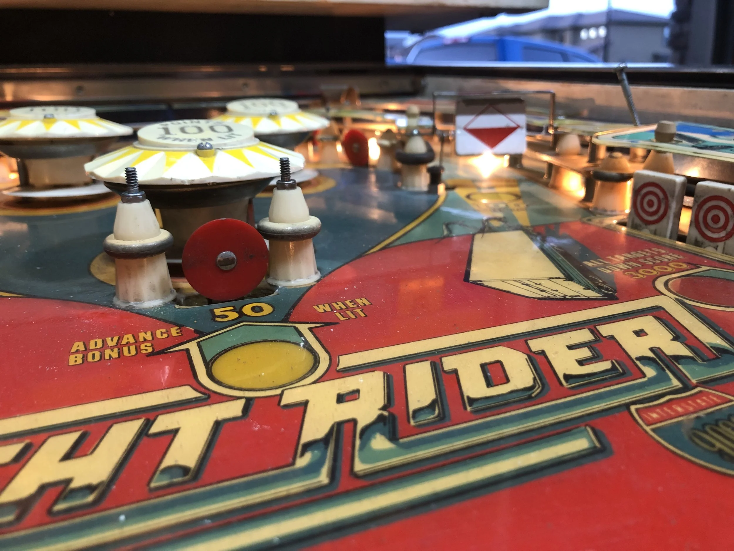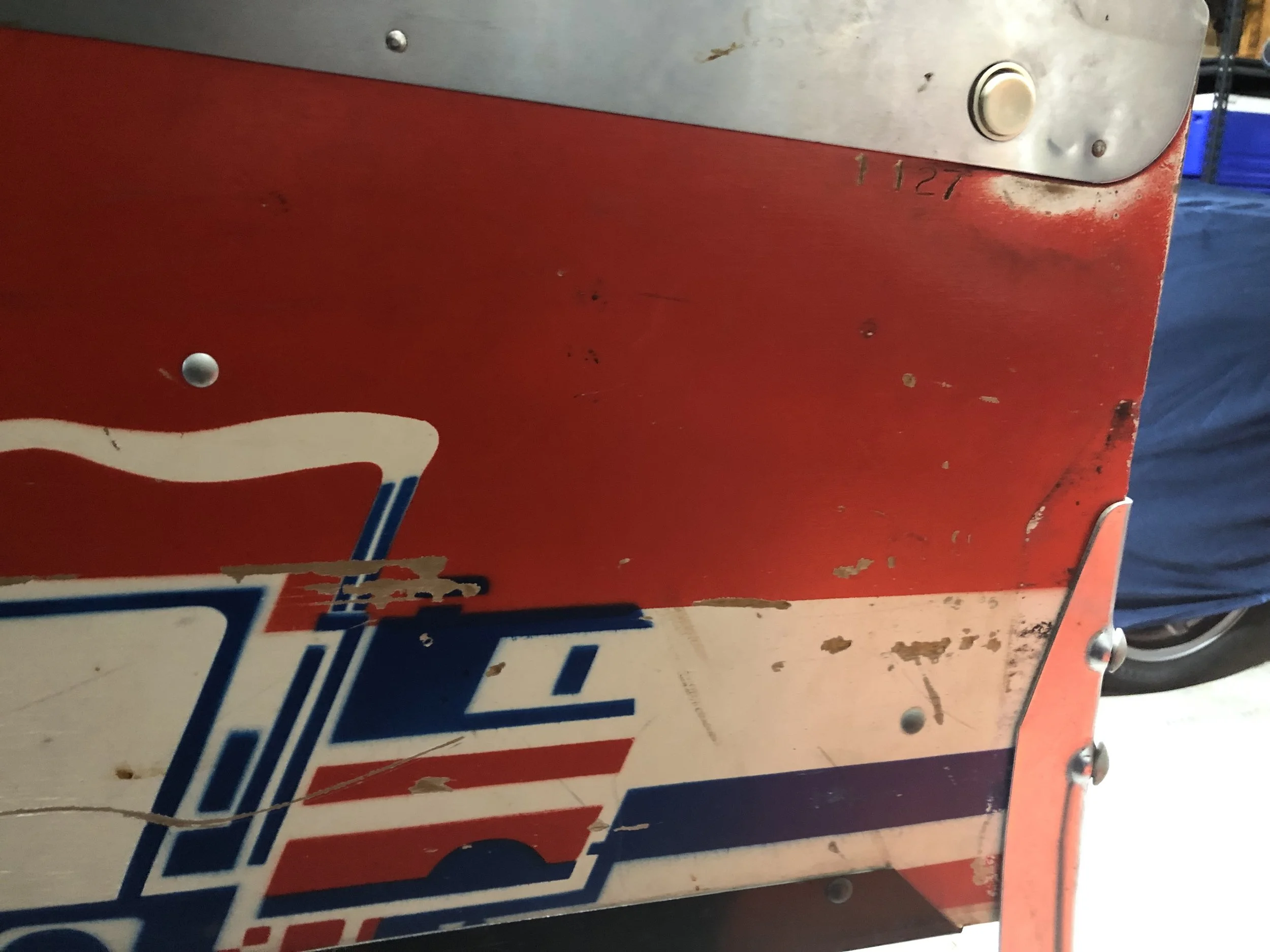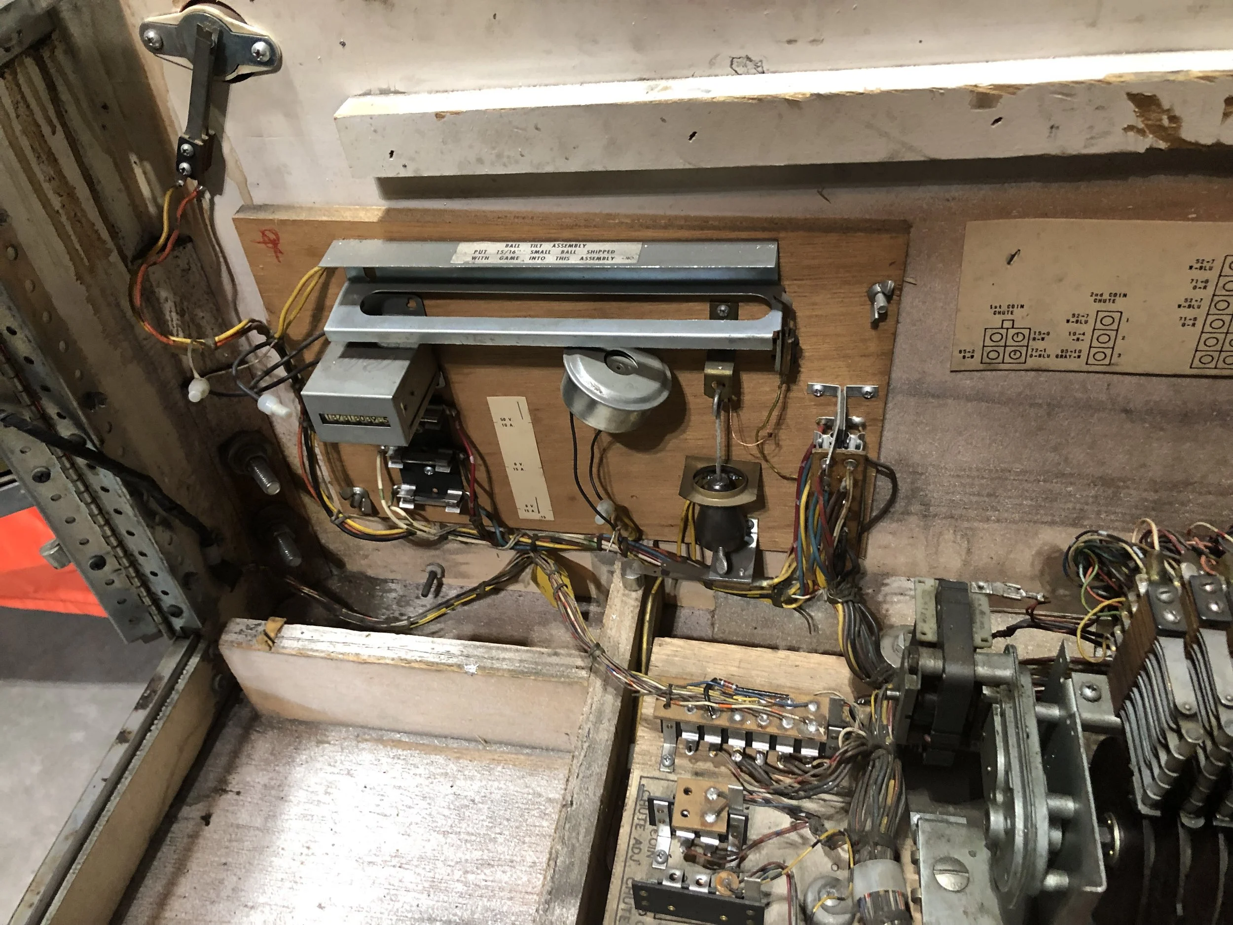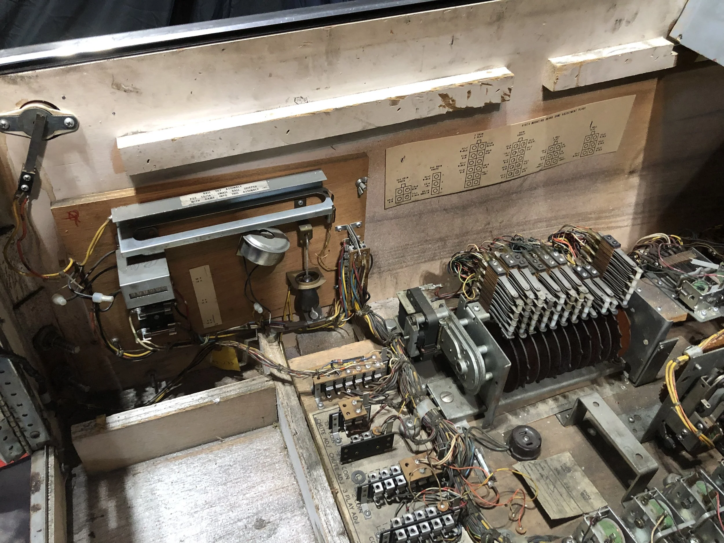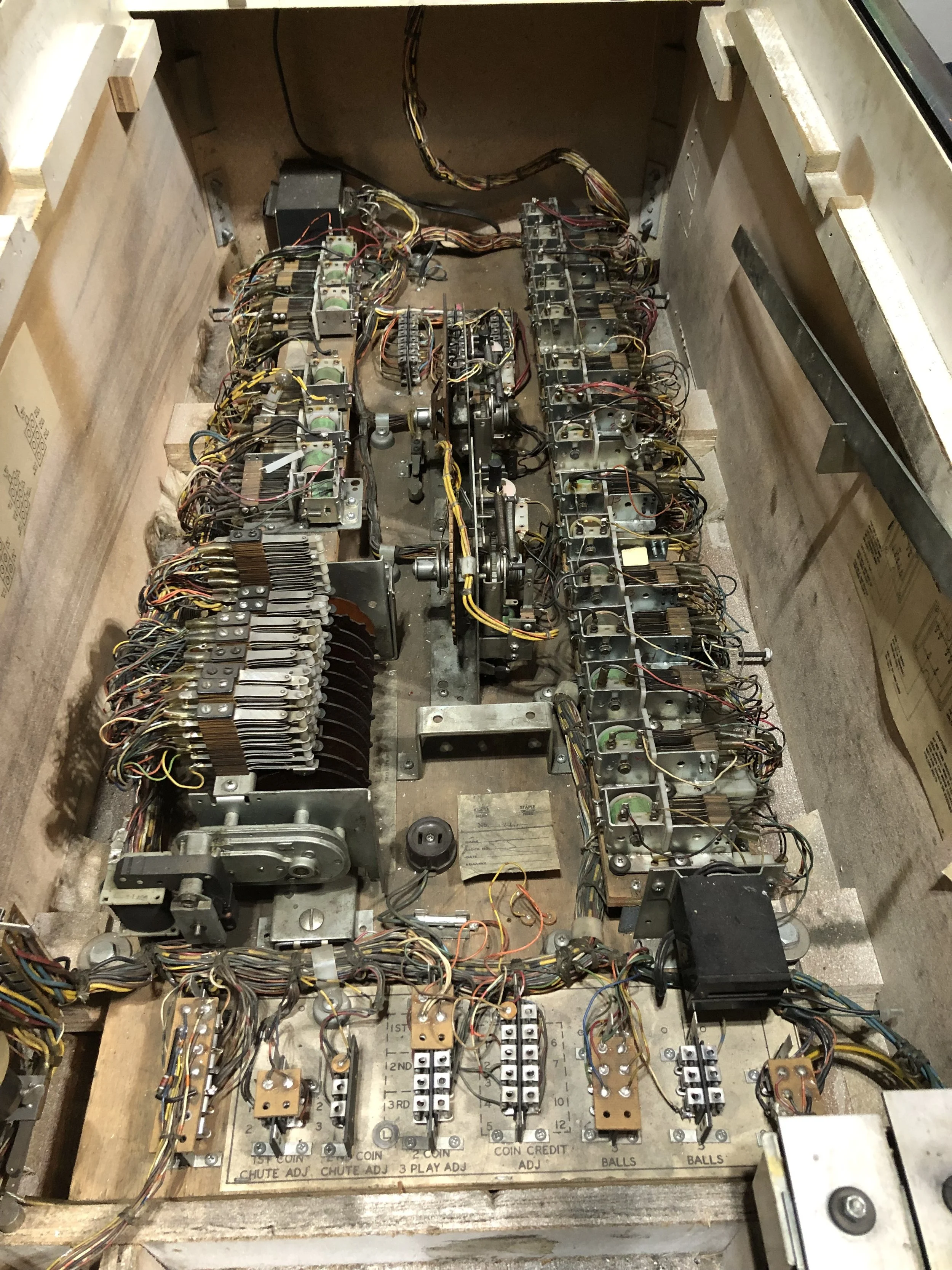 This was going to be interesting - while the backglass was original and in fantastic shape, most everything else needed serious attention. Burned coils, blown playfield, rusty brackets and legs, wiring hacks, and plastics that were either faded, cracked, or both. Cabinet was structurally sound but gouges, scratches, and corner damage needed repairs (along with a repaint). And tons and tons of dirt and grime. Everywhere.